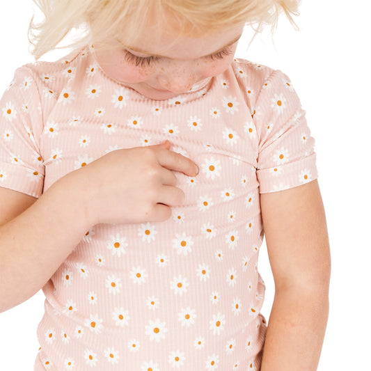 Pink Daisy Two-Piece Ribbed Bamboo Short Sleeve Kids Pajama Pants Set