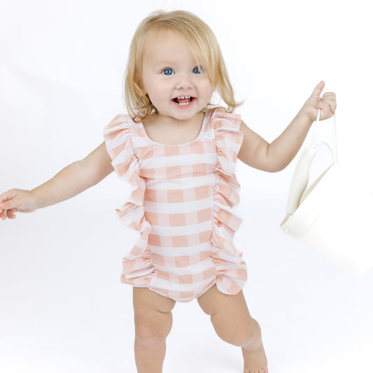 Pink Gingham Ruffle Front One Piece Girls Swimsuit