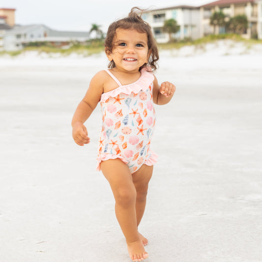 Sandy Seashells Ruffle Leg One Piece Girls Swimsuit