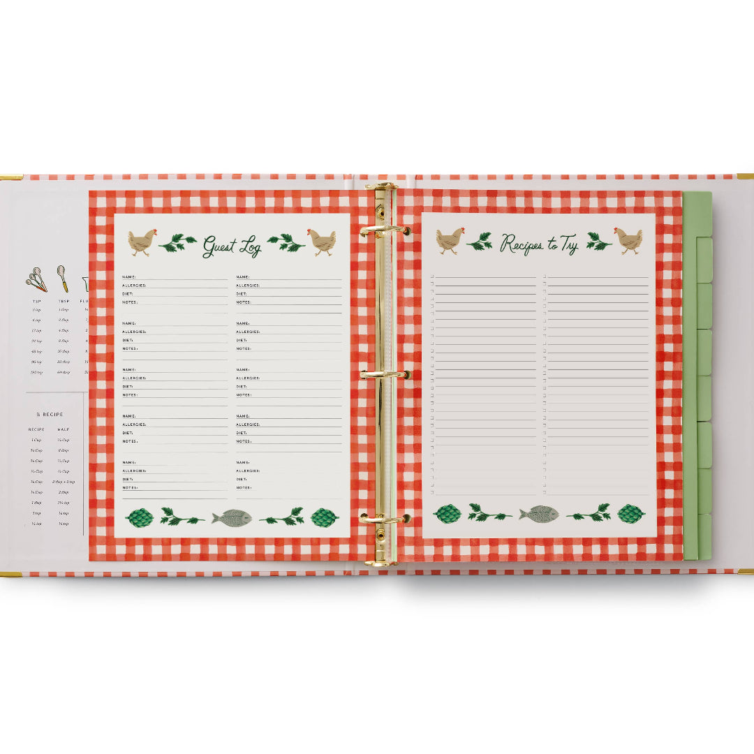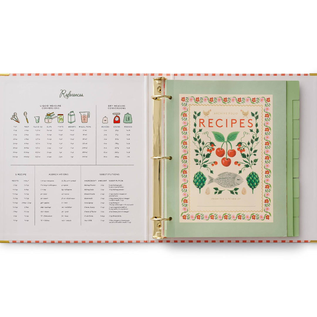 Illustrated cover with reinforced metal corners. Printed in full color and foil stamped. Metallic gold foil 10 clear recipe card sleeves. Three-ring mechanism. Double-sided pocket folder 16 tabbed dividers. Adhesive labels. Reference pages & illustrations.