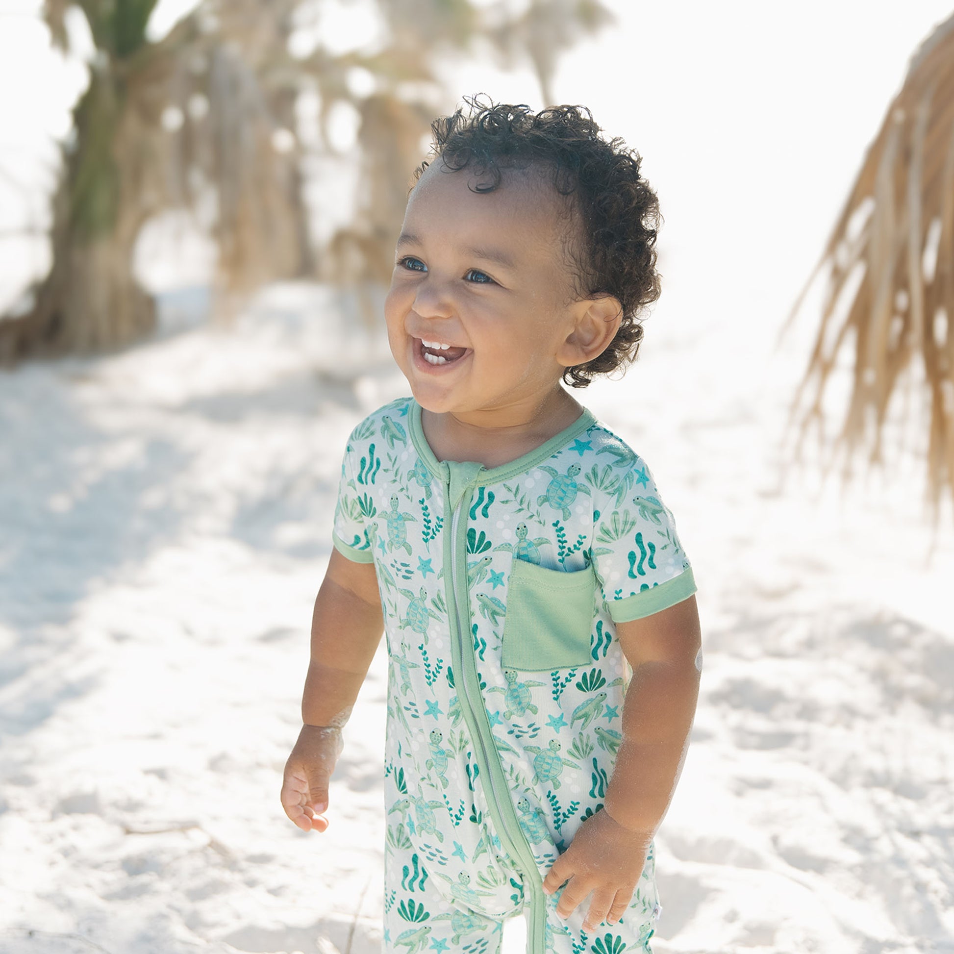 The softest bamboo shortie romper in our Turtles print, full of adorable turtles for spring and summer! Don't forget to see other styles in this print for a cute sibling match!
